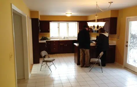 These Wayne, IL clients requested an expanded traditional kitchen with off white cabinets and a large accented / entertaining island. The original kitchen was dark, small with drywall soffits, segmented by multiple doorways, and had a peninsula that kept them from adequate function. By removing the poorly designed doorway to the dining room, the footprint and design options expanded substantially. Playing with cabinet depths and angles, we were able to create a mixed finish island that accommodates food prep, serving, and sitting. Custom appliance niches were designed to house coffee service and a rarely used microwave. Focal points were established by removing the soffits to expand the cabinet lines, creating a sink wall with glass doors and a cooktop space with a custom wood hood.